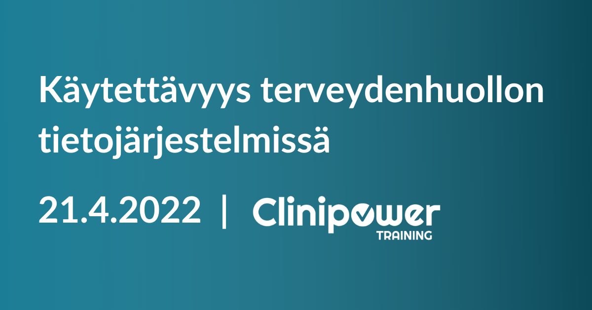 Järjestäjä: Clinipower Finland Oy Käytettävyyssuunnittelu ja -testaus ovat avainasemassa terveysteknologiaohjelmistojen menestyksessä ja turvallisessa käytössä. Terveydenhuollon tietojärjestelmissä erityispiirteinä ovat mm. erilaisten käyttäjäryhmien määrä, tietojärjestelmien modulaarisuus, integroitavuus ja konfiguroitavuus.Tietojärjestelmätuotteen käytettävyyssuunnittelu vaatii erilaista strategiaa verrattuna laitetuotteeseen. Clinipower Finlandin järjestämässä koulutuksessa perehdytään käytettävyyssuunnitteluun osana toimivaa tuotekehitystä - keskittyen terveydenhuollon tietojärjestelmiin, jotka luokitellaan lääkinnällisiksi laitteiksi. Koulutuksessa käsitellään käytettävyysprosessia myös jo