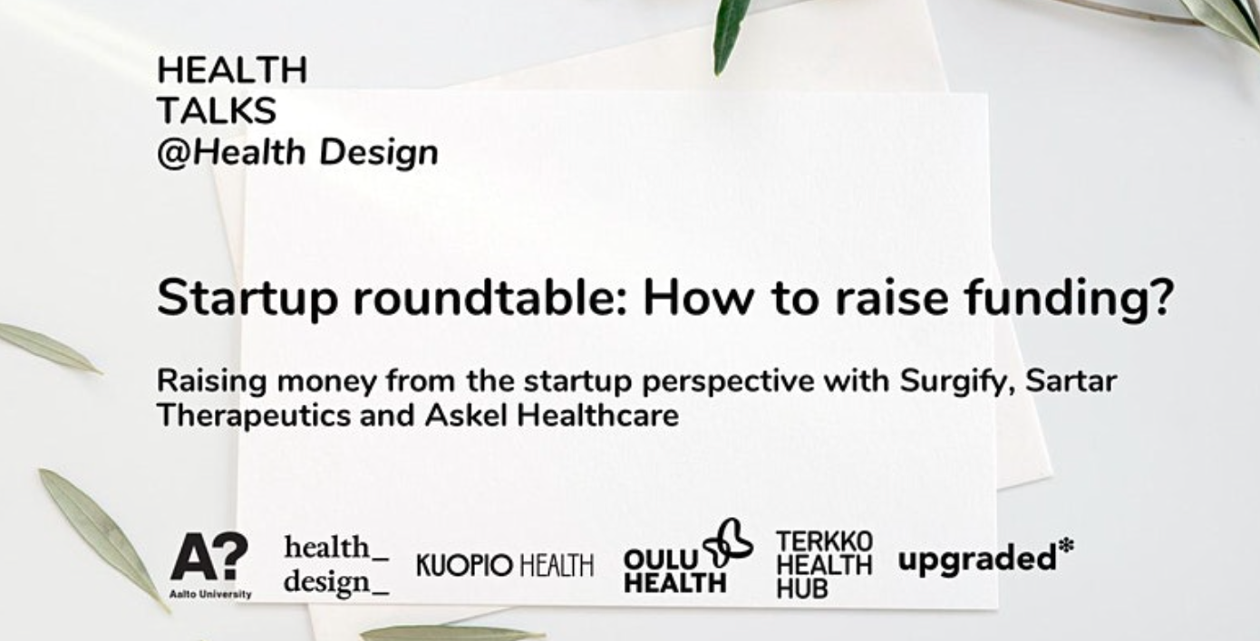 Organiser: Terkko Health Hub, Aalto University, Health Design, Kuopio Health, OuluHealth ecosystem, and Upgraded Getting funding to your startup is not an easy task! During this webinar you will get insights from three startups on how they have successfully raised funding. The event will be organised as a roundtable discussion between three founders: Visa Sippola